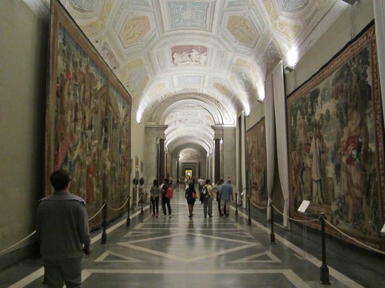 The Vatican Museums were absolutely stunning!  For some reason I can't understand I was worried about the battery on my phone and I kept turning it off so I didn't have it at the ready for many pictures which was unfortunate since we were allowed to take pictures at the Vatican Museum but not at the Sistine Chapel.  I think we only saw a small portion of the museum, I'm sure that it might have taken days to get through it all, but what we saw was gorgeous. My favorite of all the rooms was the Tapestry Hall.  Here the ceiling appeared to have white marble carvings covering the entire room.  I was busy marveling at how someone could carve marble into a ceiling so perfectly when our guide told us that it wasn't marble at all, but was a trompe l'oeil painting!  It was impossible to tell that it wasn't real marble which made the ceiling even more amazing! The tapestries that hung on the walls were made between the fifth and the seventeenth centuries and are painstakingly maintained.
