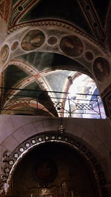 St. Benedict's Monastery in Subiaco felt like heaven, literally.  Spending time here was truly a mountaintop experience!  Just as we suffer and struggle to reach the ultimate goal of heaven, reaching St. Benedict's Monastery was also a mighty challenge, at least it seemed so to me.  Massimo, our skillful driver, took us on a harrowing ride up a narrow, one-lane, winding road with deep drop-offs to reach the monastery which was at the top of the mountain.  Every once in a while a car would come from the opposite direction and Massimo would have to pull over and let them pass.  How those cars were able to pass on that narrow road was truly a miracle.   Despite Massimo's skill, we passengers were overly fearful. Seriously, there were a few screams and calls to Fr. Bill to offer general absolution to everyone on the bus in case we fell over the side and never reached the monastery.  Massimo was probably laughing at the foolishness of his passengers who were lacking trust both in his skill and the providence of God.